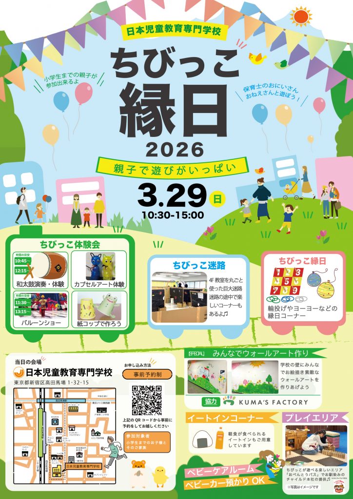 暖かい春の陽気に誘われて、日本児童教育専門学校(日児)が一日限りの**「ちびっこ縁日」に変身します! 子どもたちの笑顔あふれるこのイベント、「保育・教育の道を目指す高校生」にとっても最高の時間が過ごせる特別な一日なんです。